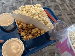 そして、ギリギリに着いたにもかかわらず、ポップコーンと大好きなキャラメルプレッツェル。そして、白桃ピューレを買って入りました♪